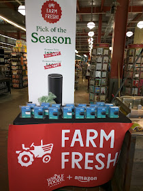 Amazon is making its presence known at the Silver Spring Whole Foods Market, after acquiring the trendy grocery chain. Signs all around the store promote Amazon, and even tout price reductions courtesy of the online giant. The giddiness extends to labeling the Amazon Echo Dot as "farm fresh."
